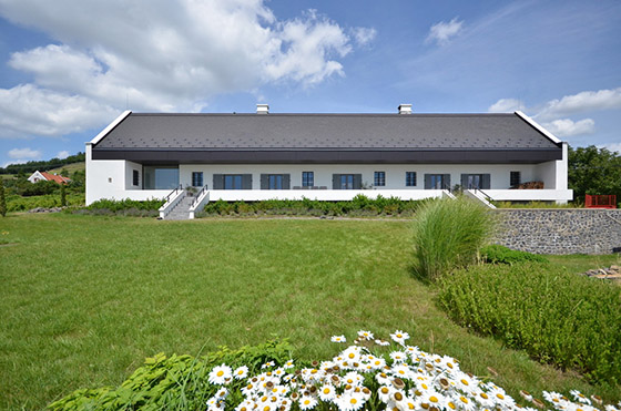 In the interior of the winemaker's cottage we used white wall surfaces along with fair-faced concrete, wood covering and cut basalt stones. In the winemaker's cottage in some ground floor rooms the surface of the ceiling is fair-faced concrete, in other rooms the ceiling is covered with wood ina similar raster to the fair-faced concrete. The sloping roof in the interior is made of fair-faced concrete, with the pattern of the wooden formwork on its surface. This severe material is balanced by the warm tones of the wood flooring and the solid white painted wood wall covering. The flooring in the ground floor is cut basalt stone, continuing to the porch. The built- in furniture is made of solid wood, and the counters, custom made washbasins are made of fiber concrete.